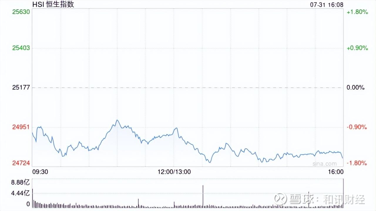 7月31日消息,港股三大指数集体下跌。截至收盘,恒生指数跌1.6%,报24773.33点,恒生科技指数跌0.69%,国企指数跌1.72%。盘面上,科网股涨跌不一,美团跌超4%,京东跌超3%,小米跌超2%,快手涨超6%;短视频概念股走强,有赞涨超12%;半导体概念股部分活跃,中芯国际涨超1%;黄金股持续走低,潼关黄金跌超7%;内房股跌幅居前,碧桂园跌超7%;中资券商股走弱,中国银河跌超5%。