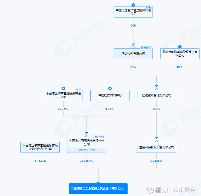 天眼查工商信息显示,近日,天津信建合企业管理合伙企业(有限合伙)成立,执行事务合伙为鑫盛利保股权投资有限公司,出资额约19.04亿人民币,经营范围为企业管理。股权全景穿透图显示,该合伙企业由中国信达(01359.HK)旗下中国金谷国际信托有限责任公司、鑫盛利保股权投资有限公司、中国信达资产管理股份有限公司陕西省分公司共同出资。