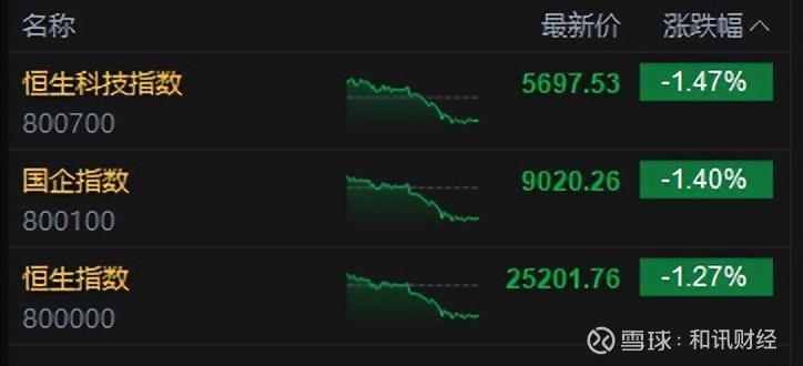 8月27日消息,港股三大指数高开低走。截至收盘,恒生指数跌1.27%,报25201.76点,恒生科技指数跌1.47%,国企指数跌1.40%。盘面上,科网股普跌,快手、美团跌超3%,京东、哔哩哔哩跌超2%,百度、网易、腾讯跌超1%;稀土概念震荡走强,金力永磁涨超2%;苹果概念涨幅居前,蓝思科技涨超7%;半导体板块冲高回落,上海复旦涨超3%,贝克微跌超1%;稳定币概念部分上涨,联易融科技涨超23%;中资券商股集体下跌,东方证券跌超5%;创新药概念高开低走,先声药业跌超6%。