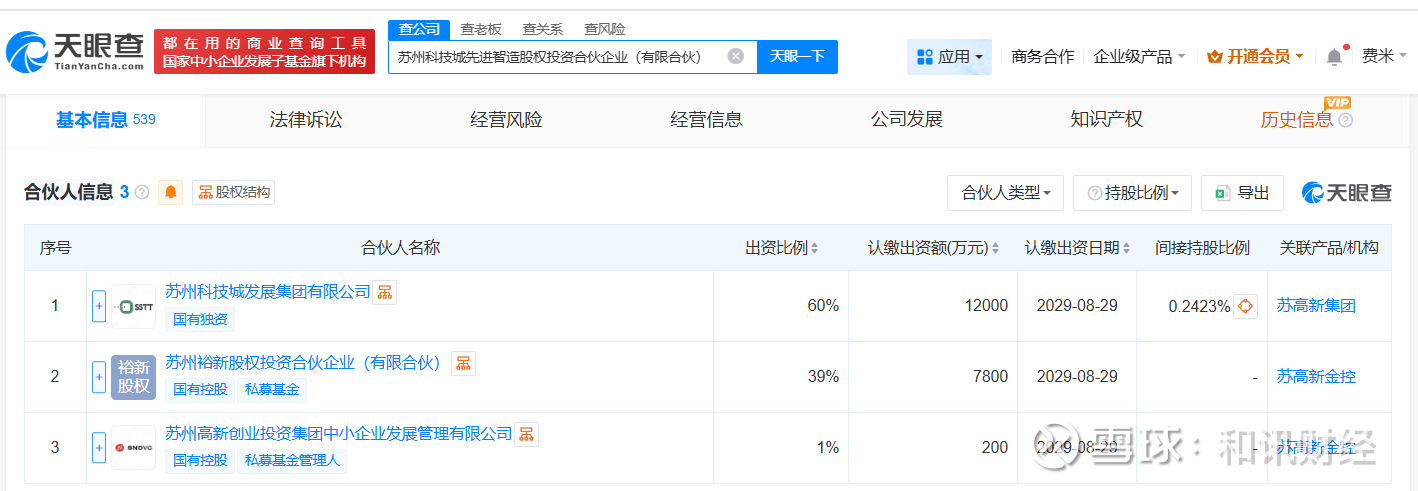 天眼查工商信息显示,近日,苏州科技城先进智造股权投资合伙企业(有限合伙)成立,执行事务合伙人为苏州高新创业投资集团中小企业发展管理有限公司,出资额2亿人民币,经营范围为股权投资、创业投资、以自有资金从事投资活动。合伙人信息显示,该合伙企业由苏州科技城发展集团有限公司、苏州裕新股权投资合伙企业(有限合伙)、苏州高新创业投资集团中小企业发展管理有限公司共同出资。