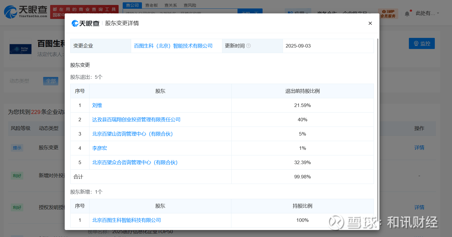 天眼查工商信息显示,近日,百图生科(北京)智能技术有限公司发生工商变更,李彦宏、刘维、百度旗下达孜县百瑞翔创业投资管理有限责任公司、北京百望众合咨询管理中心(有限合伙)等退出股东行列,新增北京百图生科智能科技有限公司为股东并全资持股。
