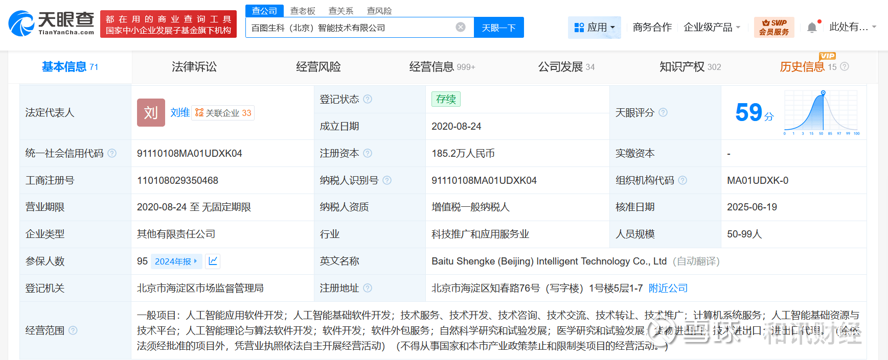 百图生科(北京)智能技术有限公司成立于2020年8月,法定代表人为刘维,注册资本185.2万人民币,经营范围含人工智能应用软件开发、人工智能基础软件开发、计算机系统服务、人工智能基础资源与技术平台、人工智能理论与算法软件开发等。