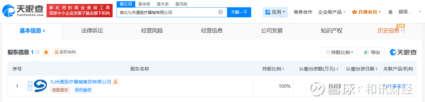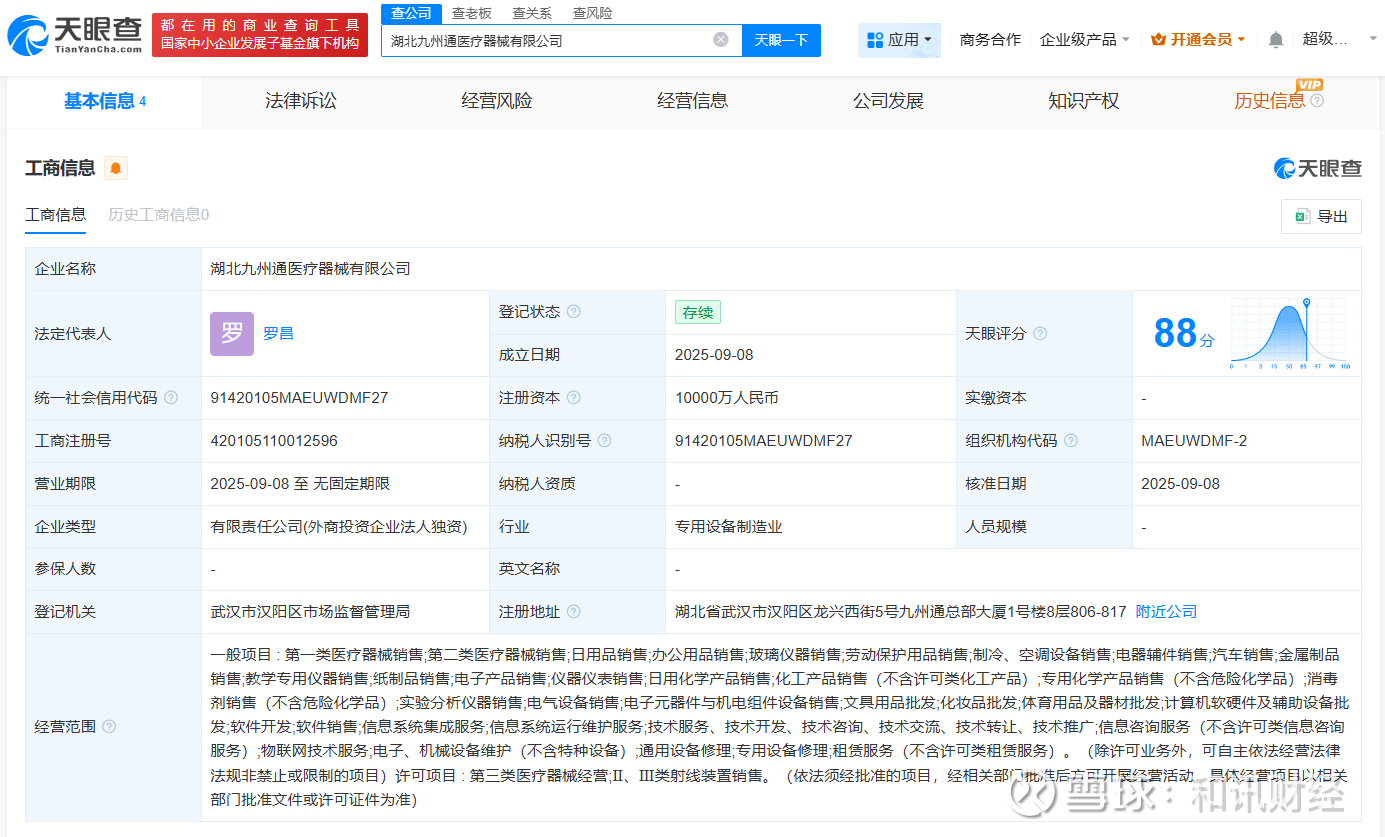 天眼查工商信息显示,近日,湖北九州通医疗器械有限公司成立,法定代表人为罗昌,注册资本1亿,经营范围包括第一类医疗器械销售、第二类医疗器械销售、日用品销售、实验分析仪器销售等。股东信息显示,该公司由九州通医疗器械集团有限公司全资持股。