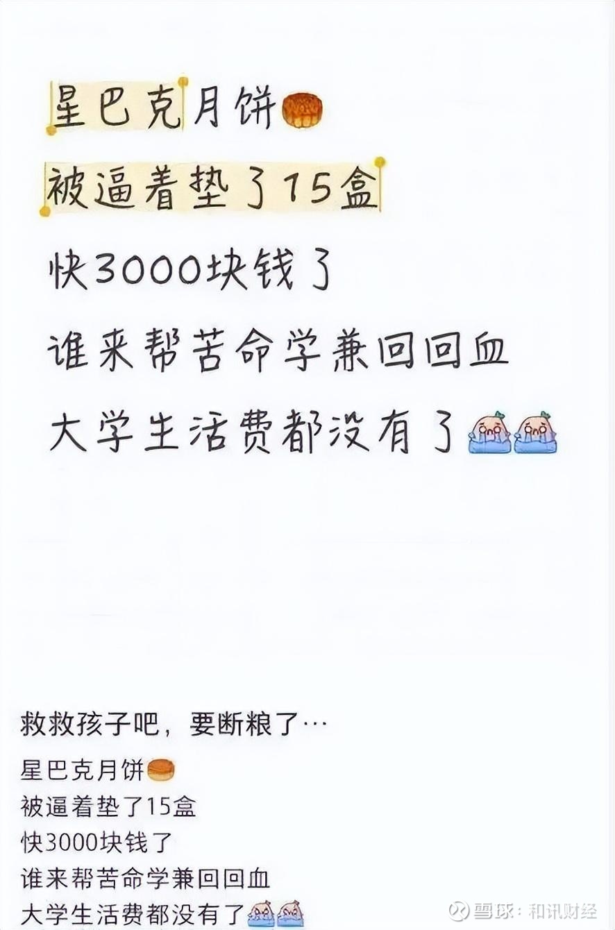 9月11日,近日有属地为湖南的网友发帖称,自己是星巴克大学生兼职员工,因门店中秋月饼销售任务,“被逼着垫了15盒”,金额近3000元,导致生活费紧张。