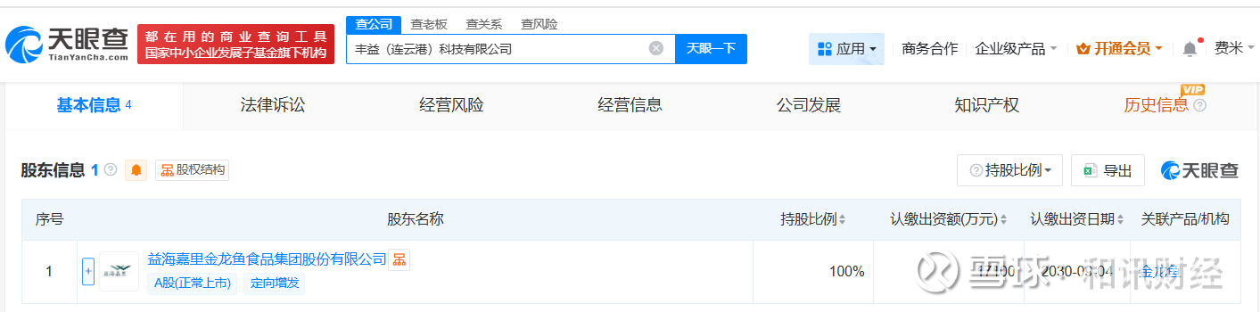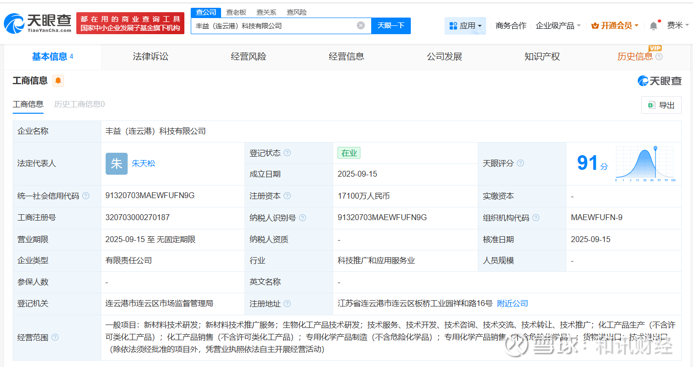 天眼查工商信息显示,9月15日,丰益(连云港)科技有限公司成立,法定代表人为朱天松,注册资本1.71亿人民币,经营范围包括新材料技术研发、新材料技术推广服务、生物化工产品技术研发等。股东信息显示,该公司由金龙鱼(300999)全资持股。