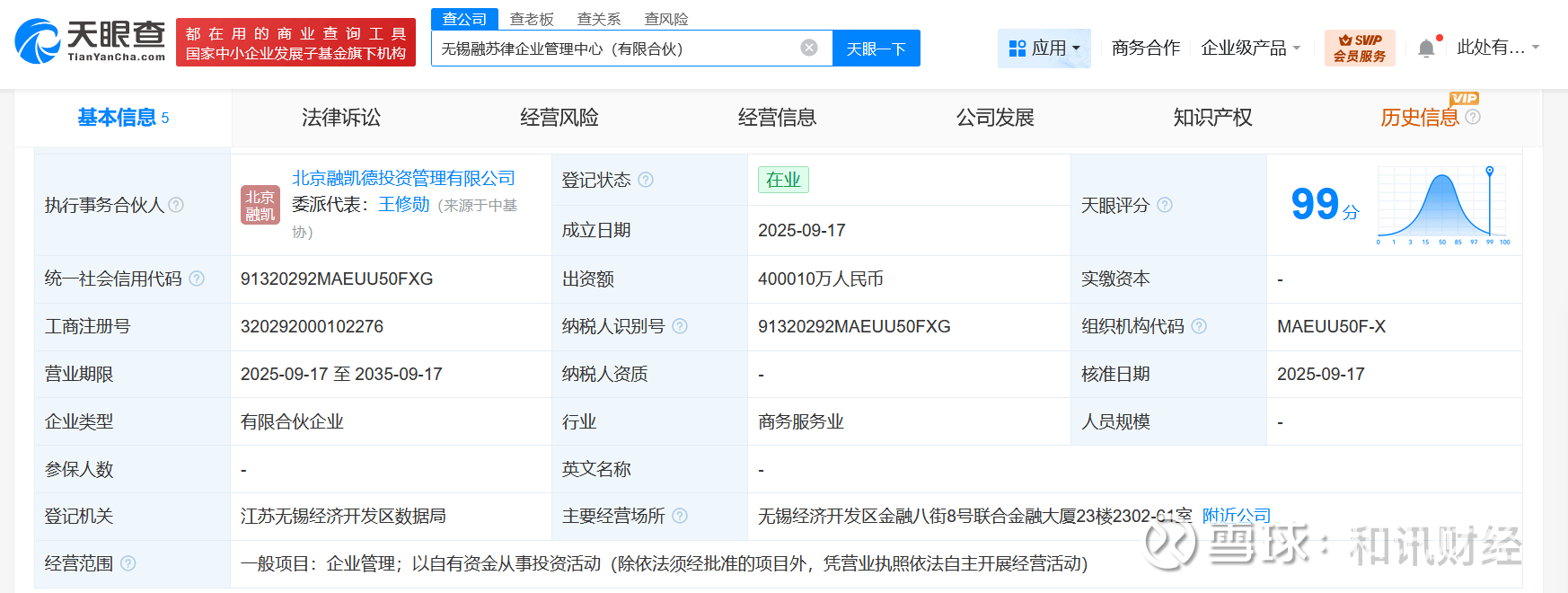 天眼查App显示,近日,无锡融苏律企业管理中心(有限合伙)成立,执行事务合伙人为北京融凯德投资管理有限公司,出资额约40亿人民币,经营范围含企业管理、以自有资金从事投资活动。合伙人信息显示,该企业由中信金融资产(02799.HK)、无锡太湖新城城市发展有限公司、北京融凯德投资管理有限公司共同出资。