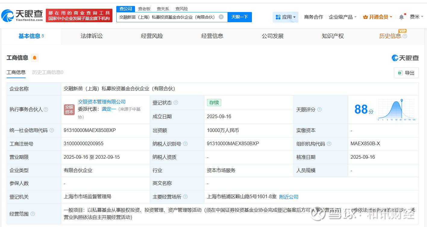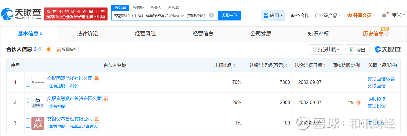 天眼查工商信息显示,近日,交融新苗(上海)私募投资基金合伙企业(有限合伙)成立,执行事务合伙人为交银资本管理有限公司,出资额1亿人民币,经营范围为以私募基金从事股权投资、投资管理、资产管理等活动。合伙人信息显示,该基金由交银国际信托有限公司、交银金融资产投资有限公司、交银资本管理有限公司共同出资。