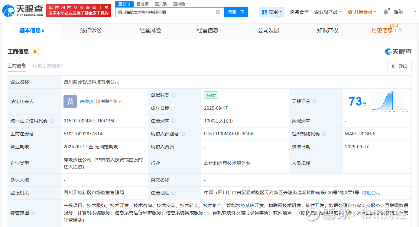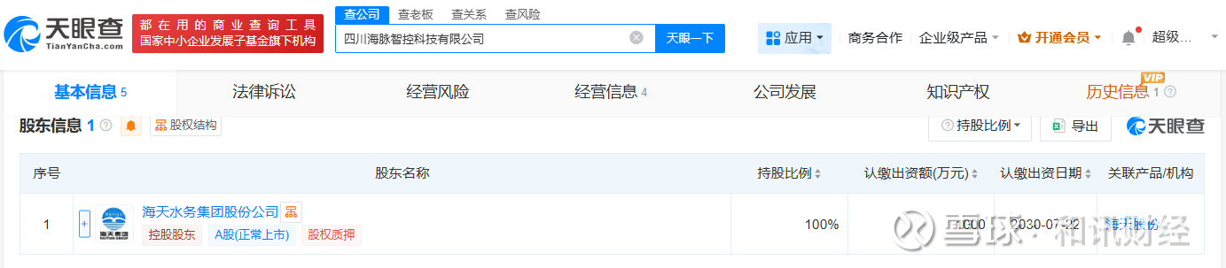 天眼查App显示,近日,四川海脉智控科技有限公司成立,法定代表人为费俊杰,注册资本1000万人民币,经营范围包括智能水务系统开发、物联网技术研发、软件开发、数据处理和存储支持服务等。股东信息显示,该公司由海天股份(603759)全资持股。