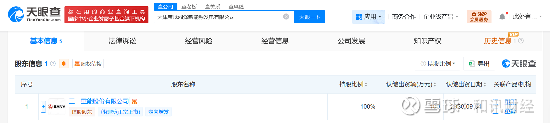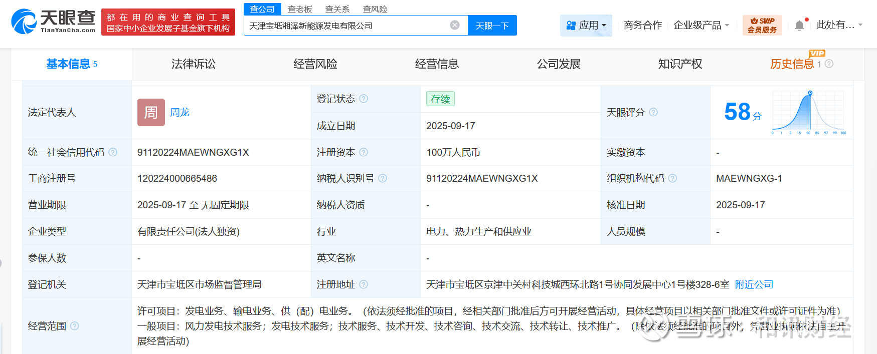 天眼查工商信息显示,近日,天津宝坻湘泽新能源发电有限公司成立,法定代表人为周龙,注册资本100万人民币,经营范围为发电业务、输电业务、供(配)电业务,风力发电技术服务,发电技术服务,技术服务、技术开发、技术咨询、技术交流、技术转让、技术推广。股东信息显示,该公司由三一重能(688349)全资持股。