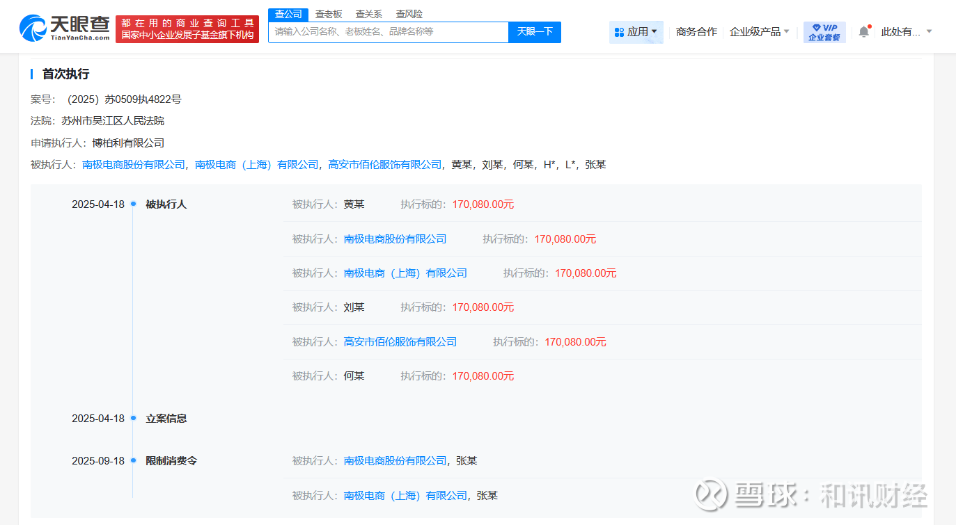 天眼查App显示,近日,南极电商(002127)及法定代表人张玉祥新增一则限制消费令,涉及侵权责任纠纷案件,申请人为博柏利有限公司(BURBERRYLIMITED),执行法院为苏州市吴江区人民法院。案件流程信息显示,今年4月,南极电商股份有限公司等已因此案被执行17万余元。