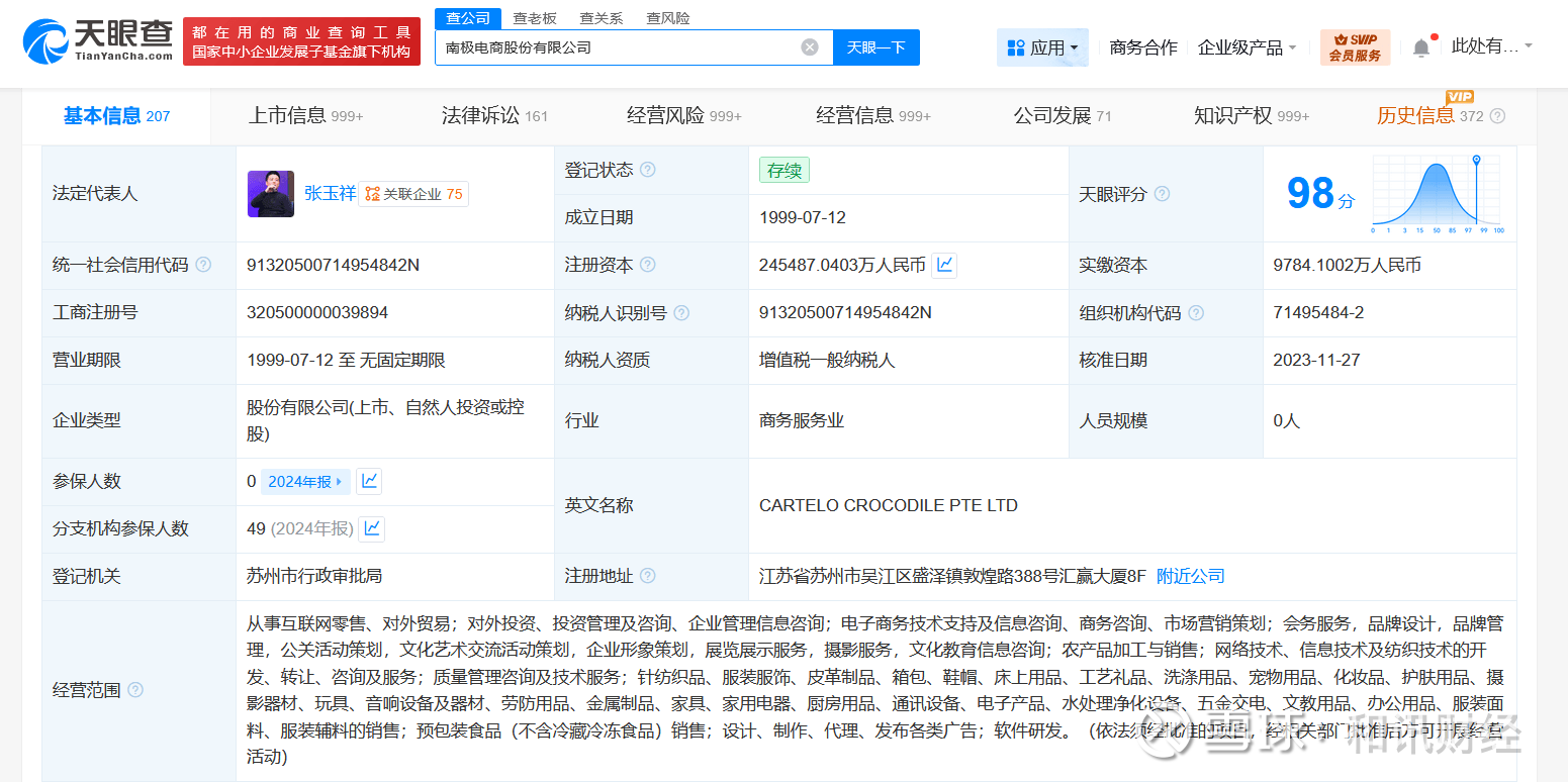 南极电商股份有限公司成立于1999年7月,注册资本约24.55亿人民币,经营范围含从事互联网零售、对外贸易,对外投资、投资管理及咨询、企业管理信息咨询,电子商务技术支持及信息咨询、商务咨询、市场营销策划等。股东信息显示,该公司由张玉祥、吴江新民实业投资有限公司、朱雪莲、上海丰南投资中心(有限合伙)等共同持股。