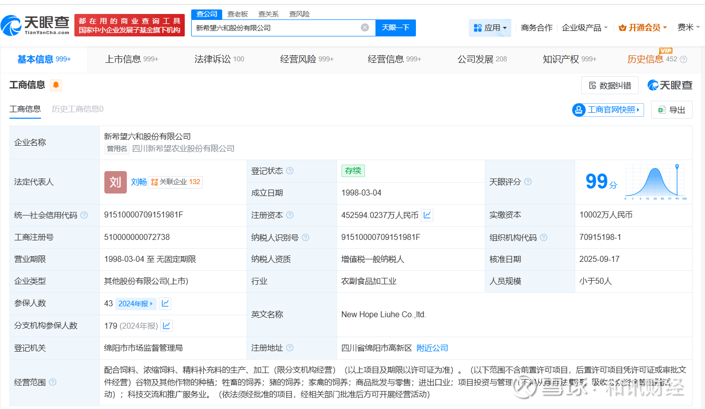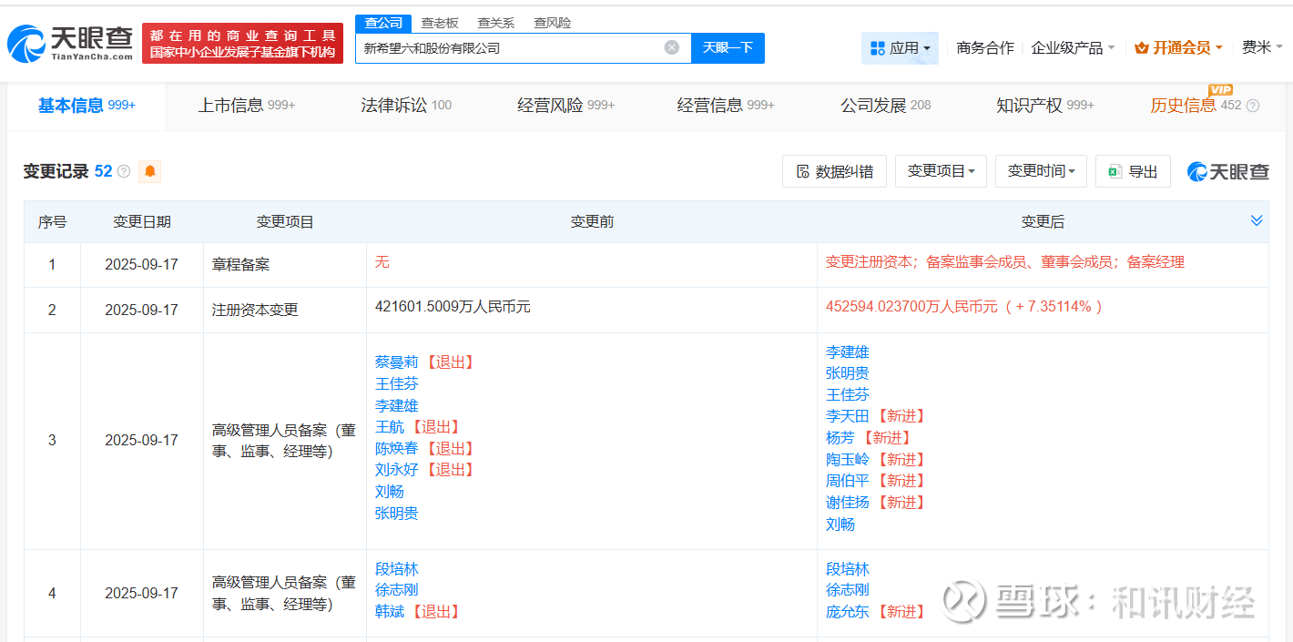天眼查App显示,近日,新希望(000876)发生工商变更,注册资本由约42.2亿人民币增至约45.3亿人民币,增幅约7%,同时多位高管发生变更。