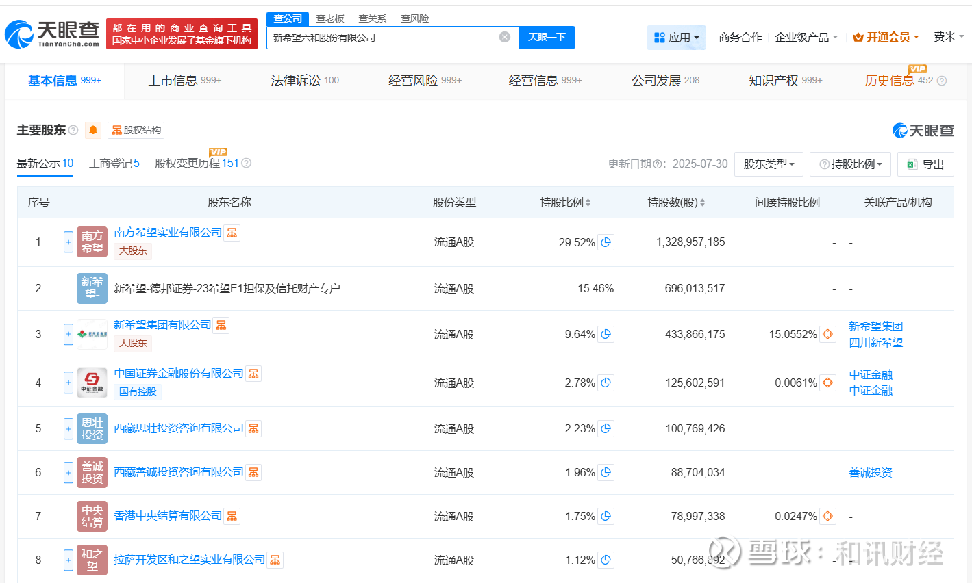 该公司成立于1998年3月,法定代表人为刘畅,经营范围包括谷物及其他作物的种植、商品批发与零售、进出口业等。股东信息显示,该公司由南方希望实业有限公司、新希望集团有限公司、中国证券金融股份有限公司等共同持股。