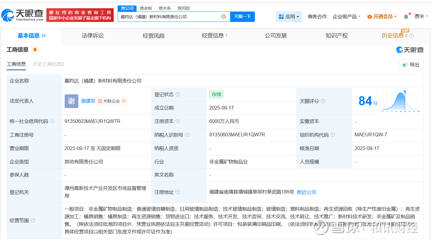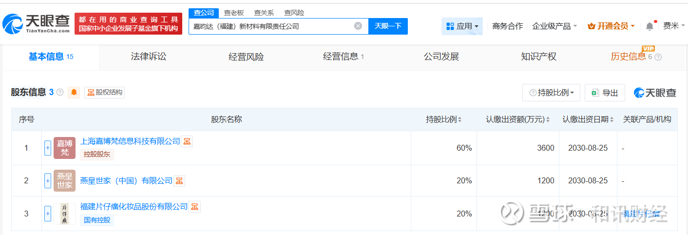 天眼查App显示,近日,嘉昀达(福建)新材料有限责任公司成立,法定代表人为谢建军,注册资本6000万人民币,经营范围包括非金属矿物制品制造、普通玻璃容器制造、日用玻璃制品制造等。股东信息显示,该公司由上海嘉博梵信息科技有限公司、燕皇世家(中国)有限公司、片仔癀(600436)旗下福建片仔癀化妆品股份有限公司共同持股。