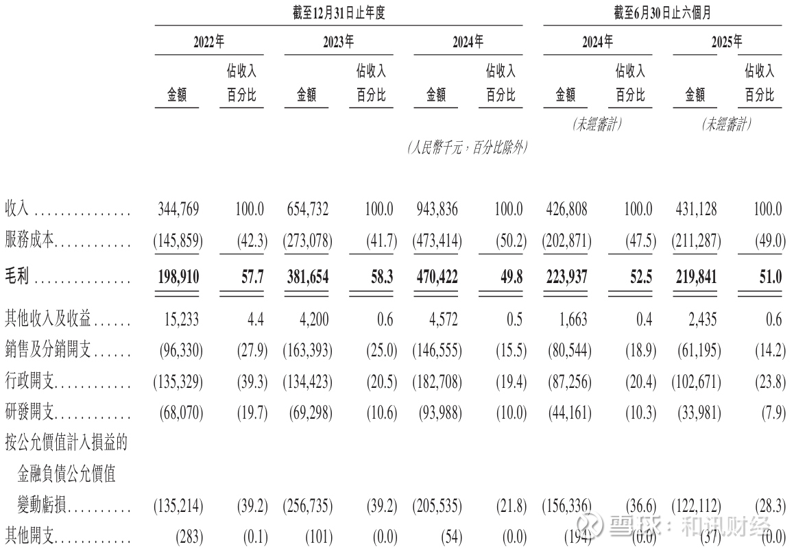 同时,值得注意的是公司绝大部分业务来自其第一大客户,同时也是公司大股东众安在线。根据披露,2022至2025上半年,公司来自于众安在线的收入分别为人民币2.71亿元、4.05亿元、4.27亿元和2.14亿元。分别占公司当期总收入的78.7%、61.8%、45.2%及49.6%。