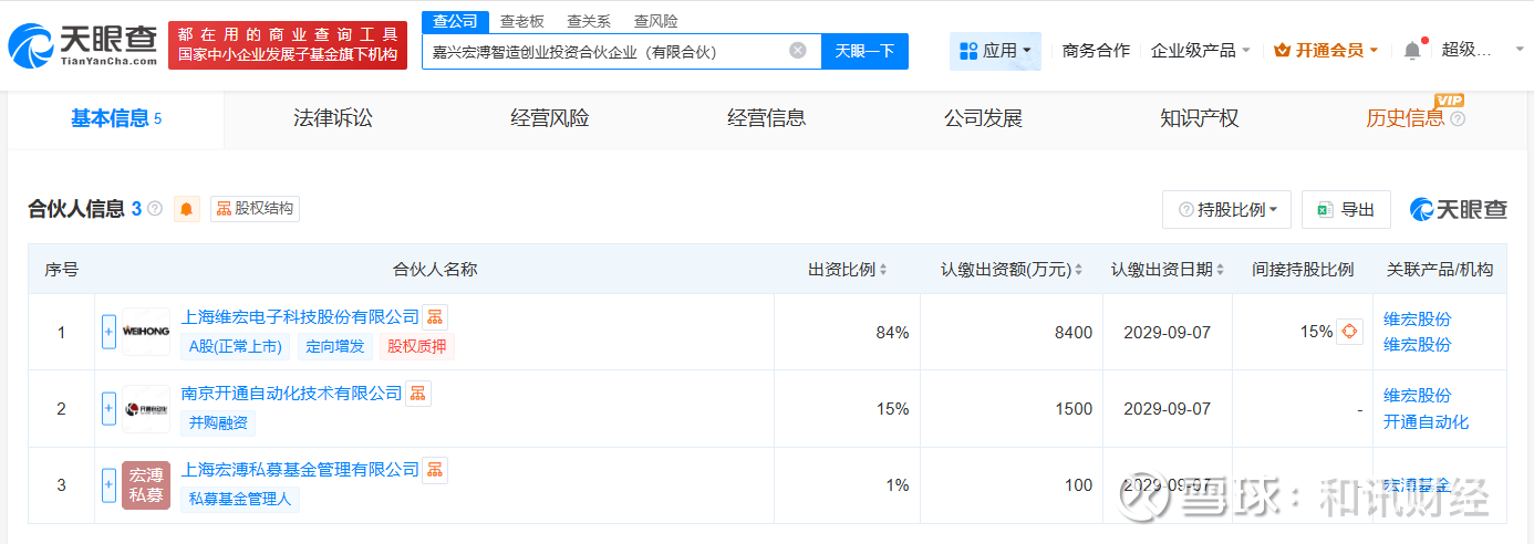 天眼查App显示,近日,嘉兴宏溥智造创业投资合伙企业(有限合伙)成立,执行事务合伙人为上海宏溥私募基金管理有限公司,出资额1亿人民币,经营范围为创业投资。合伙人信息显示,该合伙企业由维宏股份(300508)及旗下南京开通自动化技术有限公司等共同出资。