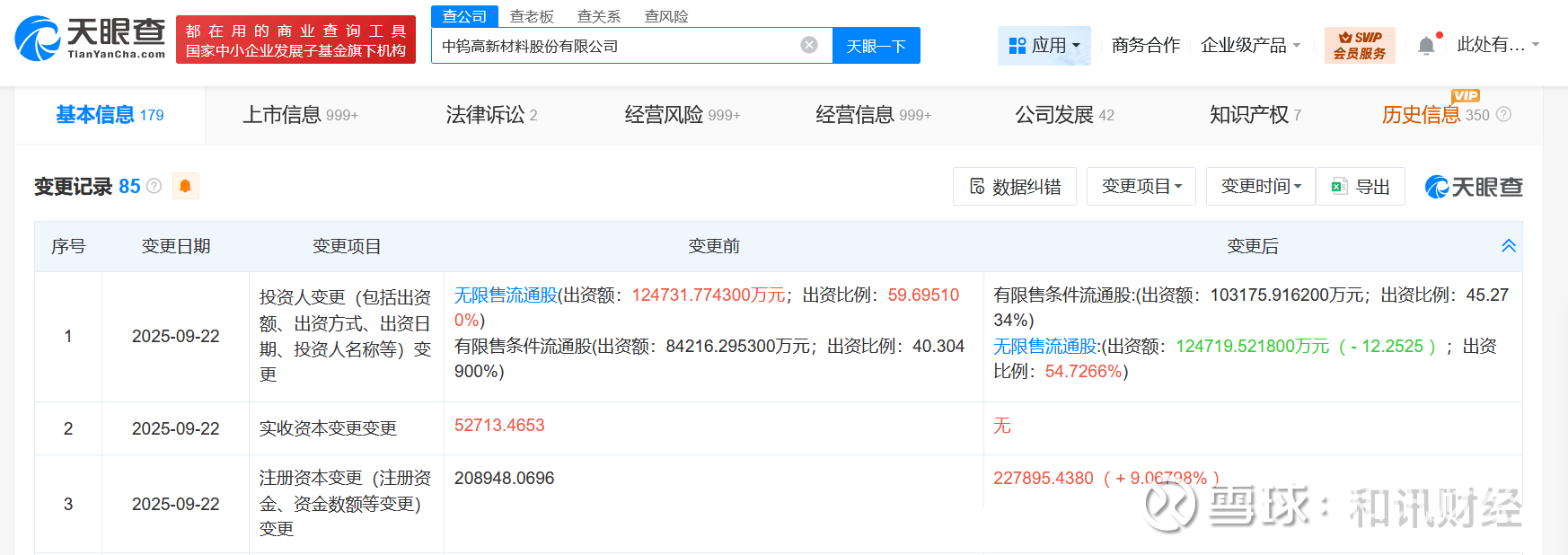 天眼查App显示,近日,中钨高新(000657)发生工商变更,注册资本由约20.9亿人民币增至约22.8亿人民币,增幅约9%。