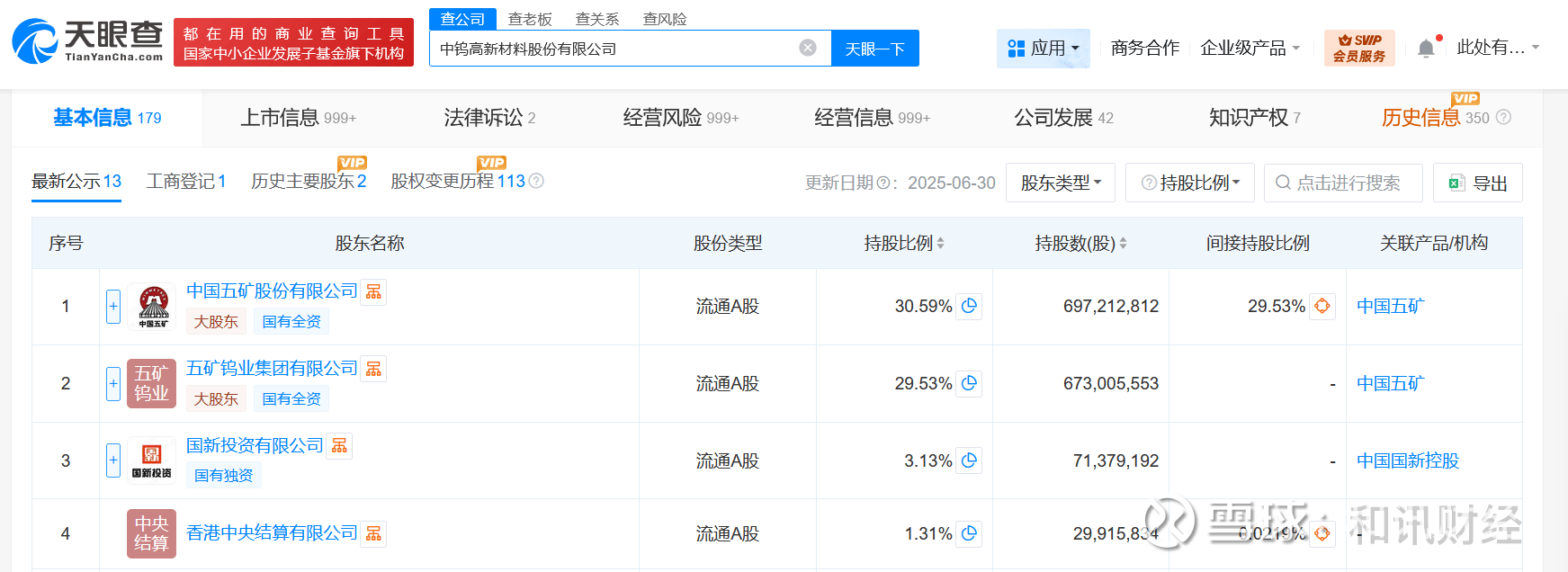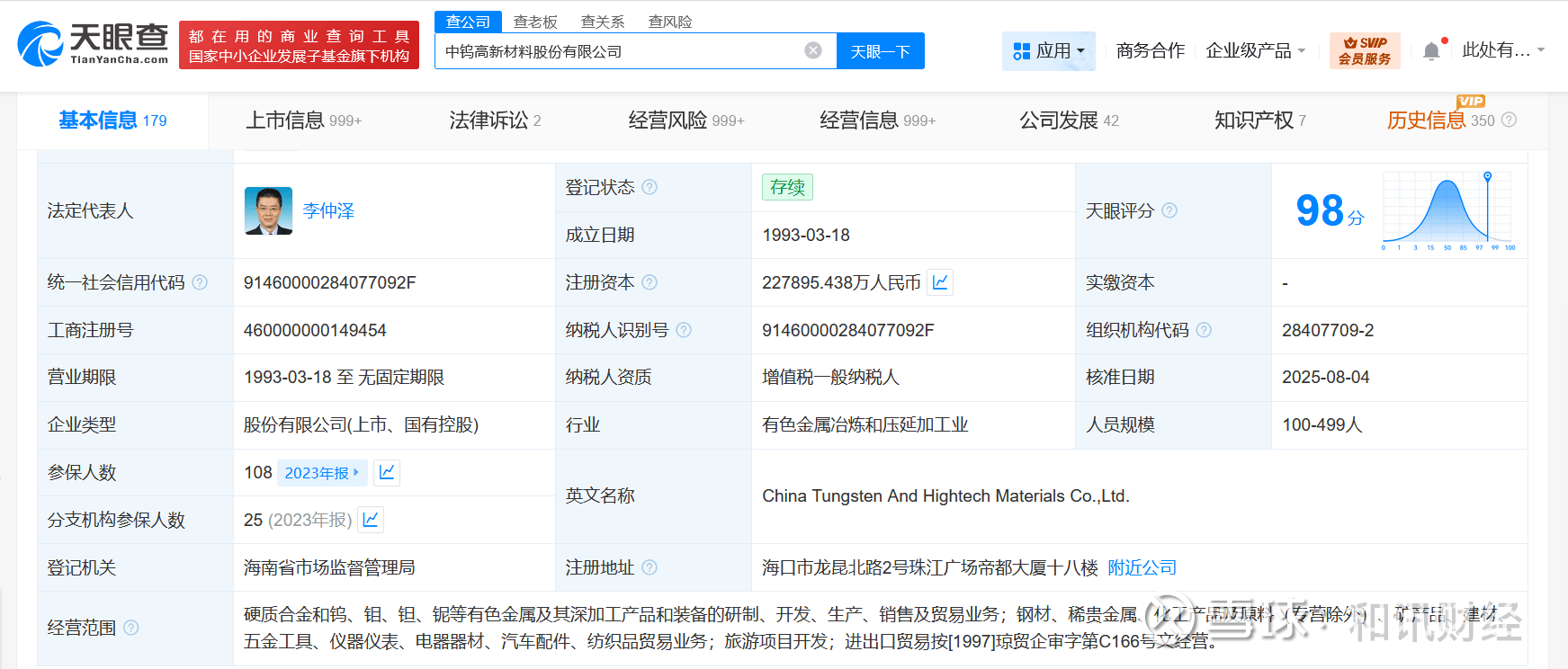 中钨高新材料股份有限公司成立于1993年3月,法定代表人为李仲泽,经营范围含硬质合金和钨、钼、钽、铌等有色金属及其深加工产品和装备的研制、开发、生产、销售及贸易业务,钢材、稀贵金属、化工产品及原料、矿产品、建材、五金工具、仪器仪表、电器器材、汽车配件、纺织品贸易业务等,由中国五矿股份有限公司、五矿钨业集团有限公司、国新投资有限公司等共同持股。