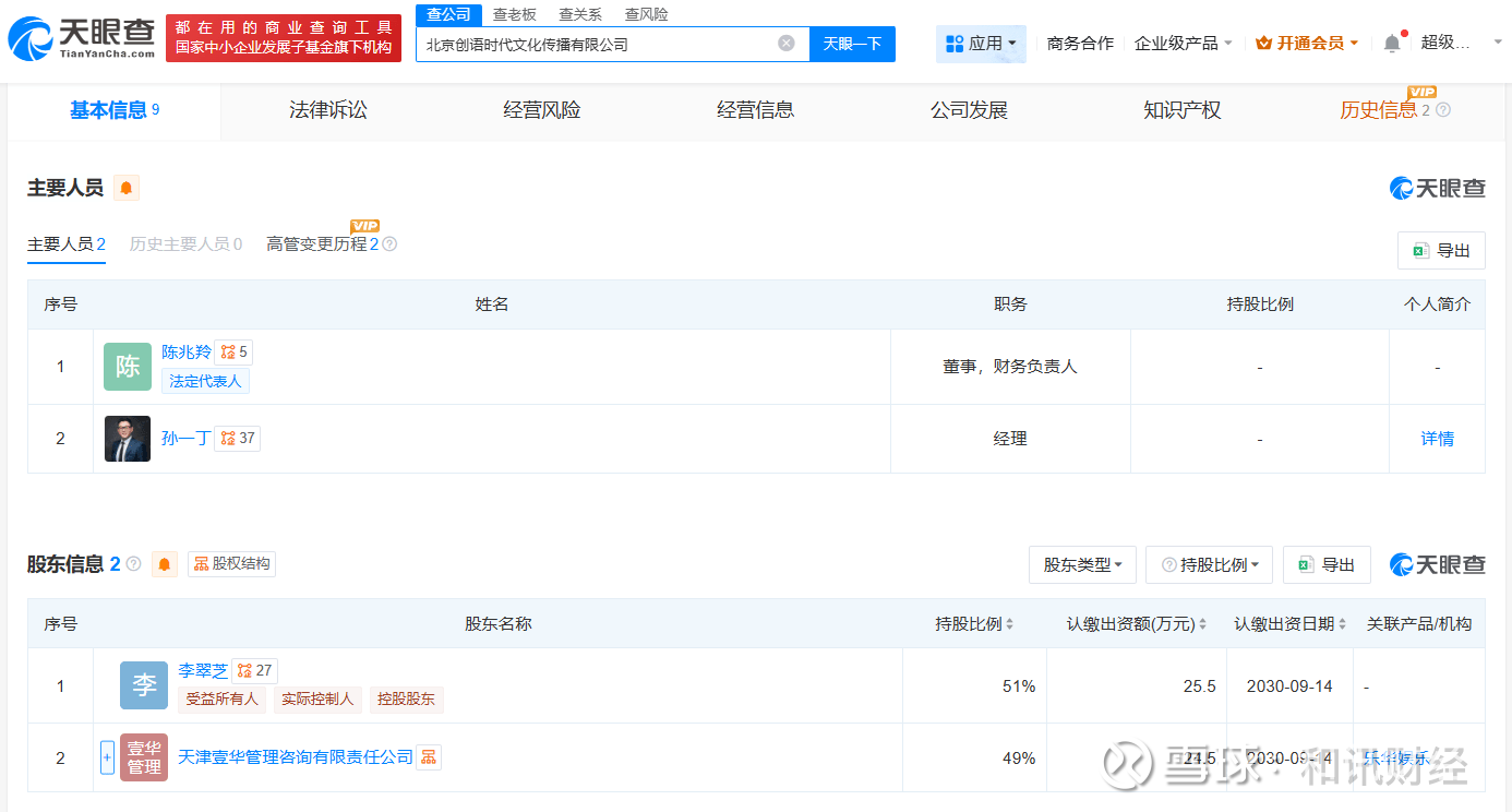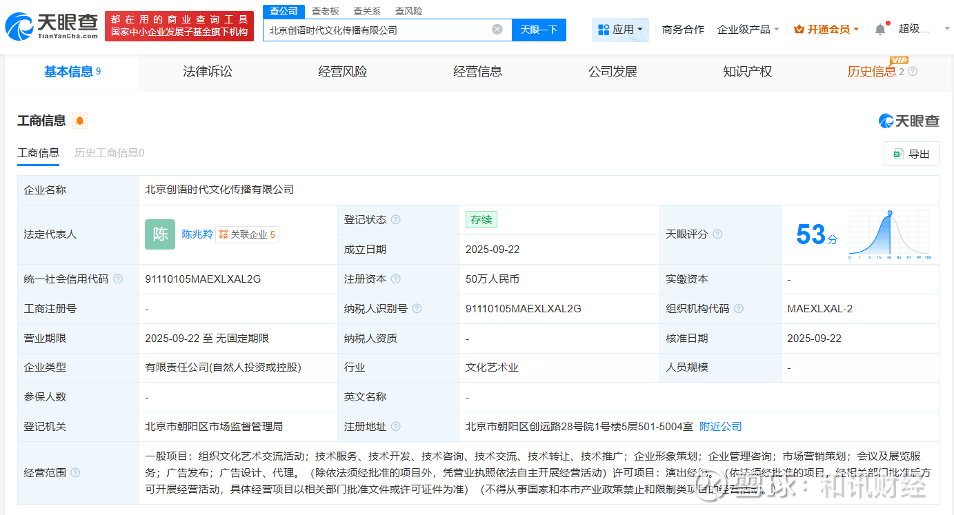 天眼查App显示,近日,北京创语时代文化传播有限公司成立,法定代表人为陈兆羚,注册资本50万人民币,经营范围包括组织文化艺术交流活动、企业管理咨询、市场营销策划等。股东信息显示,该公司由李翠芝、乐华娱乐旗下天津壹华管理咨询有限责任公司共同持股。
