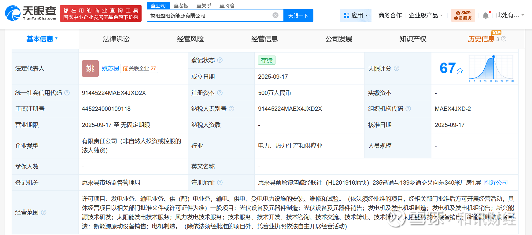 天眼查App显示,近日,揭阳盛阳新能源有限公司成立,法定代表人为姚苏艮,注册资本500万人民币,经营范围含发电业务、输电业务、供(配)电业务,输电、供电、受电电力设施的安装、维修和试验,光伏设备及元器件制造,光伏设备及元器件销售,发电机及发电机组制造,发电机及发电机组销售,新兴能源技术研发,太阳能发电技术服务等。股东信息显示,该公司由明阳智能旗下明阳华南智慧能源(韶关)有限公司全资持股。