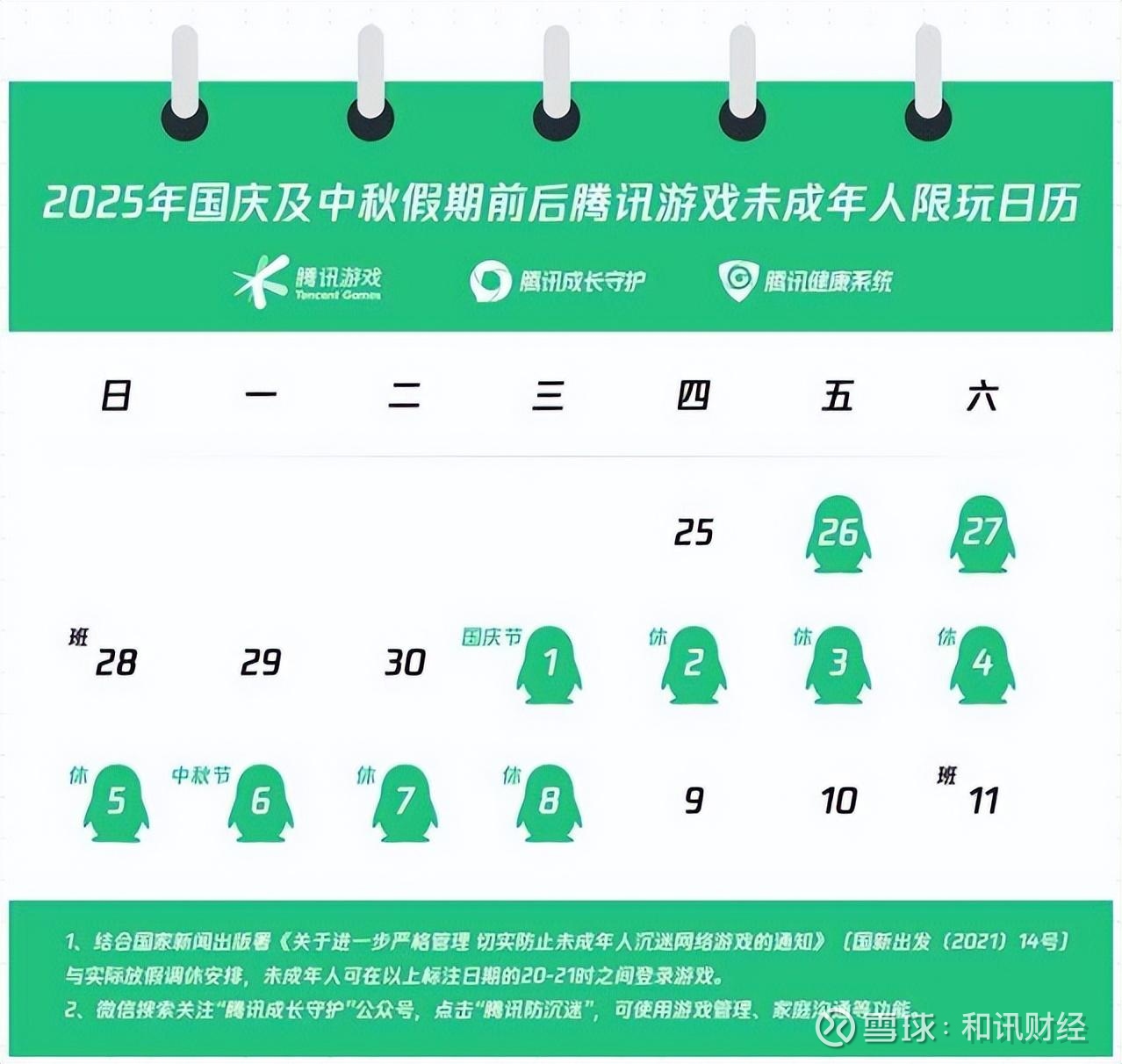 腾讯游戏旗下在中国大陆地区运营的网络游戏面向未成年人的游戏限玩执行如下:9月26-27日(周五、周六)及10月1-8日(国庆及中秋假期)每日的20时至21时之间,未成年人可登录游戏。其余工作日,以及调休上班的9月28日(周日)及10月11日(周六),均为禁玩时段。