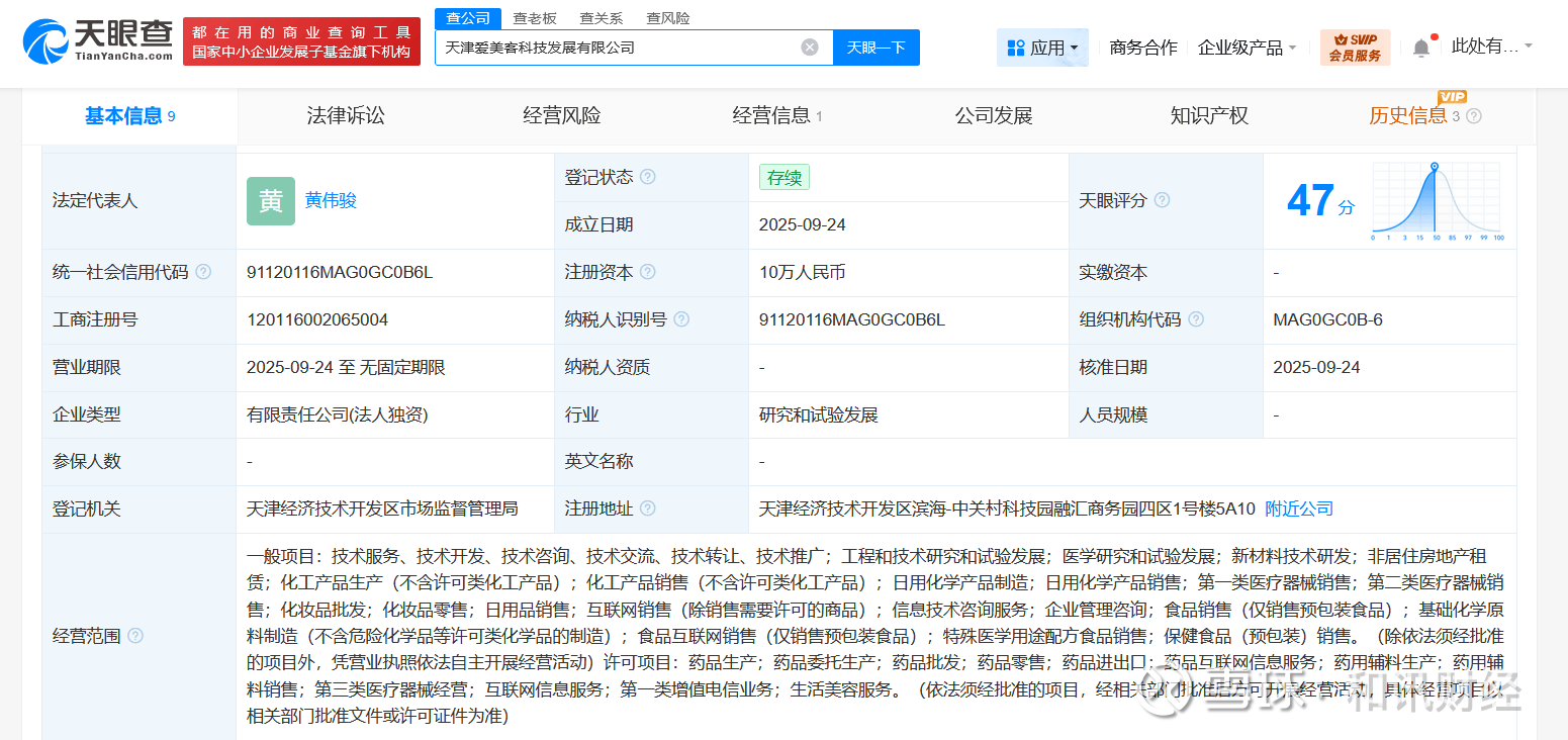 天眼查App显示,近日,天津爱美客科技发展有限公司成立,法定代表人为黄伟骏,注册资本10万人民币,经营范围含工程和技术研究和试验发展、医学研究和试验发展、新材料技术研发、非居住房地产租赁、化妆品批发、化妆品零售、信息技术咨询服务、药品生产、药品委托生产等。股东信息显示,该公司由爱美客(300896)全资持股。