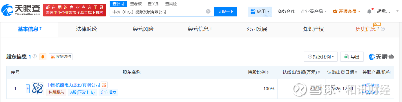 天眼查App显示,近日,中核(山东)能源发展有限公司成立,法定代表人为洪源平,注册资本5亿人民币,经营范围包括发电技术服务、海水淡化处理、工程和技术研究和试验发展、进出口代理等。股东信息显示,该公司由中国核电(601985)全资持股。