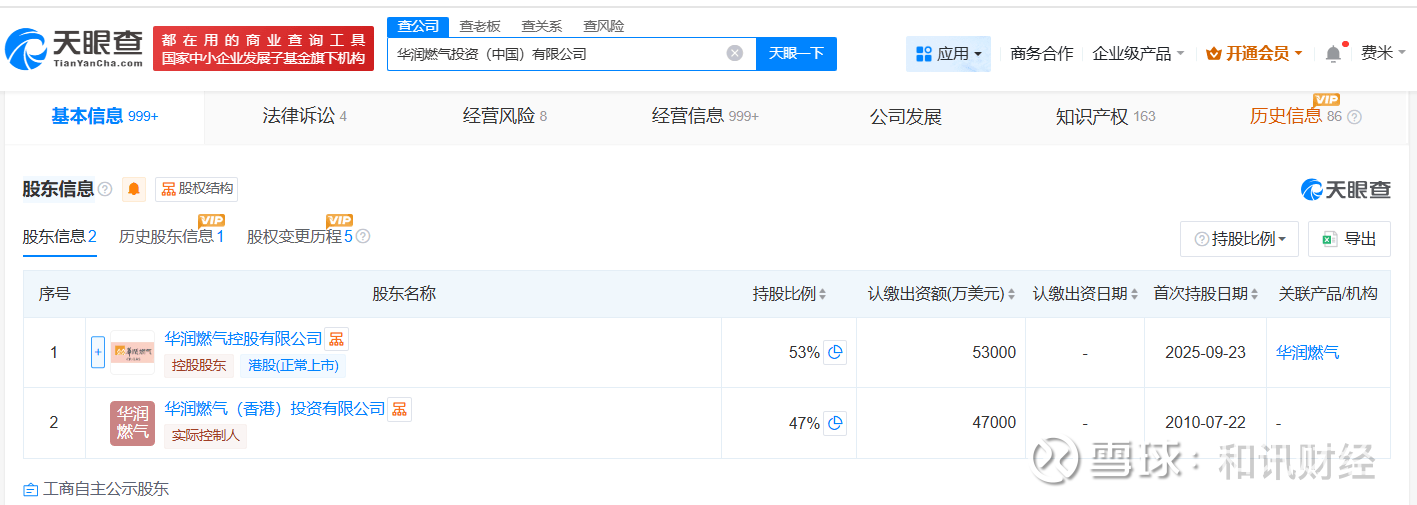 天眼查App显示,近日,华润燃气投资(中国)有限公司发生工商变更,新增华润燃气控股有限公司为股东,同时注册资本由4.7亿美元增至10亿美元,增幅约113%。