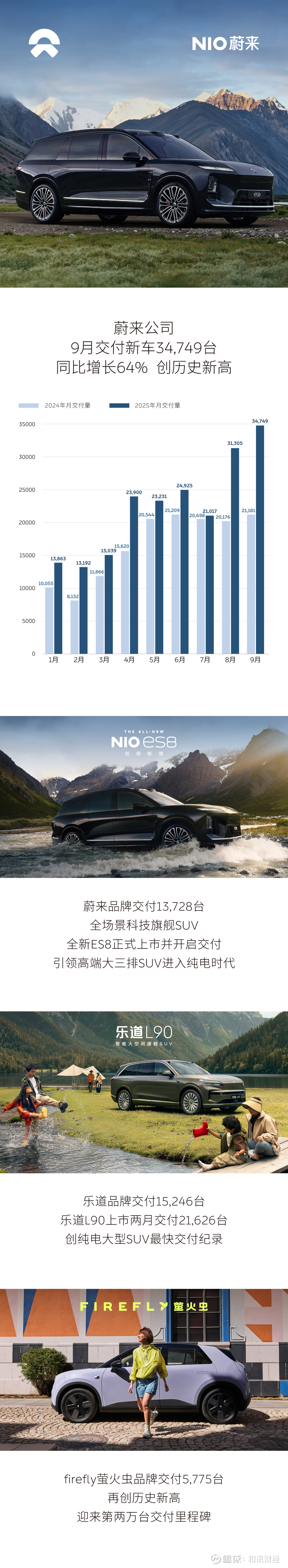 2025年9月,蔚来公司交付新车34,749台,同比增长64%。其中,蔚来品牌交付新车13,728台;乐道品牌交付新车15,246台;firefly萤火虫品牌交付新车5,775台。截至目前,蔚来公司已累计交付新车872,785台。其中,蔚来品牌累计交付新车762,176台;乐道品牌累计交付新车90,279台;firefly萤火虫品牌累计交付新车20,330台。