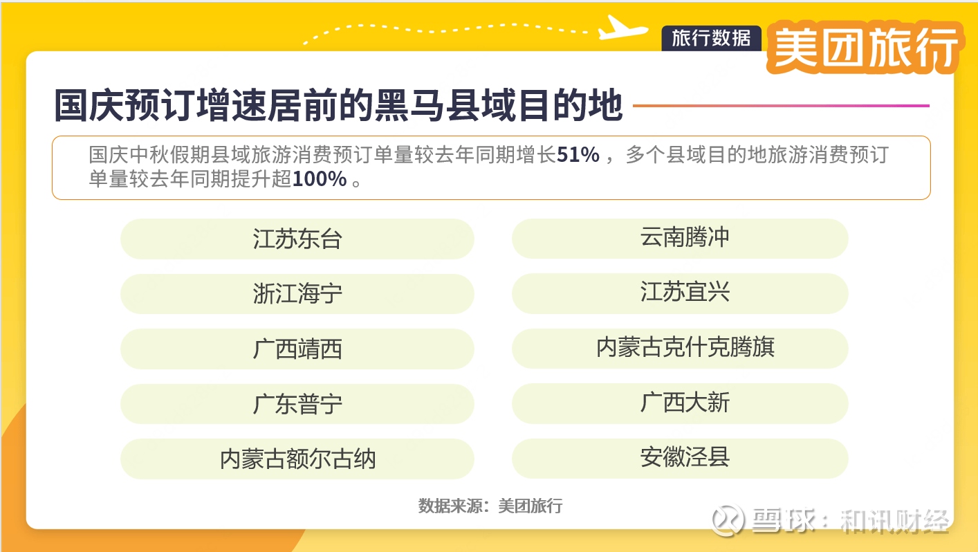 深度旅游时代,更多宝藏小城走进公众视野。例如,从上海出发,高铁2小时以内即可到达的江苏东台、江苏宜兴、浙江海宁等,吸引周边短途游客逛吃古镇,享天然氧吧,观潮起潮落。根据美团旅行数据,国庆中秋假期大城市周边县域目的地预订单量较去年同期增长51%,其中江苏东台、浙江海宁、广西靖西、广东普宁、内蒙古额尔古纳、云南腾冲、江苏宜兴、内蒙古克什克腾旗、 广西大新、安徽泾县等目的地旅游消费预订单量较去年同期提升超100%。