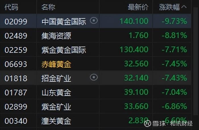 黄金股普跌,中国黄金国际跌超9%。消息面上,今天凌晨,现货黄金失守3960美元/盎司关口,较高位回落近100美元/盎司,COMEX黄金期货收跌1.95%。据报道,当地时间10月9日晚,哈马斯高级官员、首席谈判代表哈利勒·哈亚发表声明宣布达成停火协议。以色列政府10日凌晨批准加沙停火协议。宝城期货指出,短期以色列与哈马斯达成停火协议,导致地缘政治紧张情绪迅速降温,叠加前期已录得较大涨幅,短期多头了结意愿较强。华泰期货表示,金价创出历史新高之后获利了结情绪或短期压制金价,但现阶段避险溢价与美联储宽松主线逻辑均未发生明显变化,未来价格有望进一步上行。