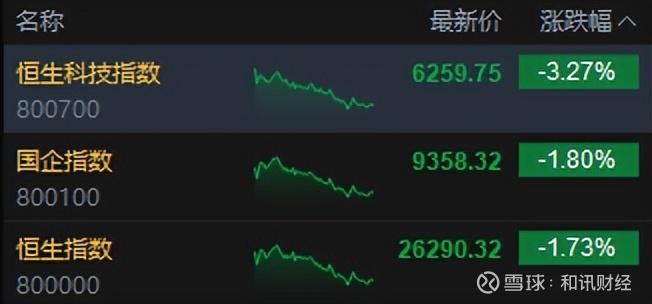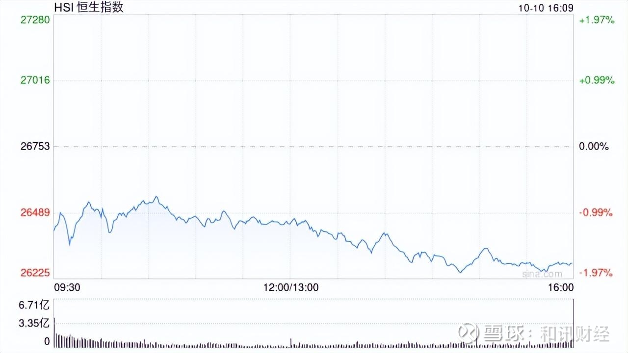 10月10日消息,港股三大指数低开低走。截至收盘,恒生指数跌1.73%,报26290.32点,恒生科技指数跌3.27%,国企指数跌1.80%。盘面上,科网股普跌,百度、快手跌超5%,阿里巴巴跌超4%,腾讯、哔哩哔哩跌超3%,京东、小米、联想跌超2%,美团、网易跌超1%;茶饮股普涨,古茗涨超12%;建材水泥股活跃,中国天瑞水泥涨超12%;黄金股普跌,中国黄金国际跌超9%;金叶国际集团上市首日涨330%,挚达科技涨超192%。