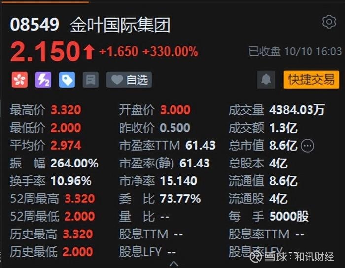 金叶国际集团上市首日涨330%。据此前消息,上一交易日,金叶国际集团暗盘一度暴涨900%,最高涨至5.00港元;最终暗盘收涨472%,报2.86港元。每手5000股,不计手续费,一手赚11800港元。公开发售阶段金叶国际集团获11464.72倍认购,公开发售的发售股份最终数目为1000万股份,占发售股份总数的约10%。合共接获约16.81万份有效申请,受理申请数目2000份,申购一手获配发股份占所申请股份总数的概约百分比为0.50%。此外,国际配售阶段金叶国际集团获1.20倍认购,国际发售股份最终数目为9000万股股份,相当于发售股份总数的90%。