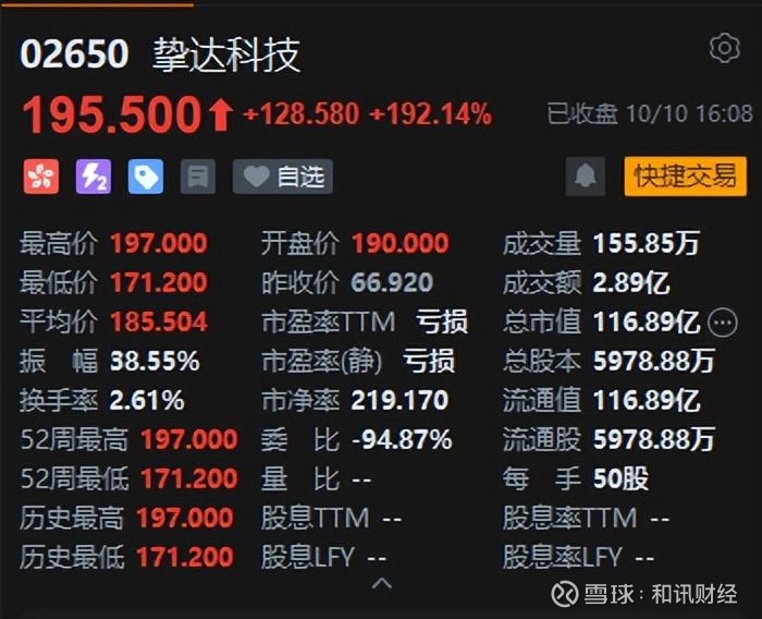 挚达科技上市首日涨超192%。据此前消息,上一交易日,挚达科技暗盘收涨181.38%,报188.3港元。每手50股,不计手续费,一手赚6069港元。另据此前消息,公开发售阶段挚达科技获5440.80倍认购,公开发售的发售股份最终数目为59.79万股份,占发售股份总数的约10%。合共接获约20.18万份有效申请,受理申请数目11958份,申购一手获配发股份占所申请股份总数的概约百分比为0.04%。此外,国际配售阶段挚达科技获2.37倍认购,国际发售股份最终数目为538.10万股股份,相当于发售股份总数的90%。
