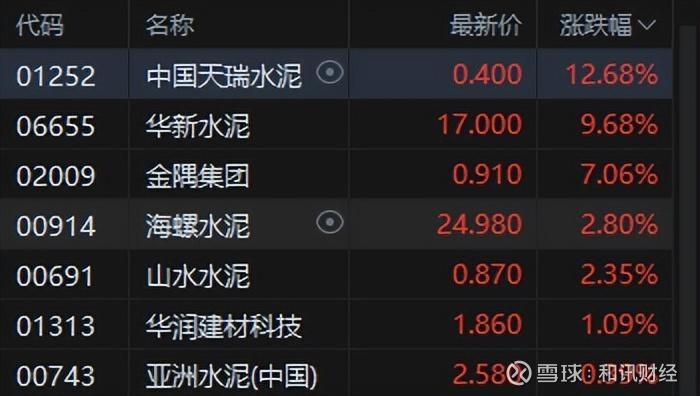 建材水泥股活跃,中国天瑞水泥涨超12%。天风证券指出,当前玻璃品种处于过去三年50%分位数以下,水泥高于玻璃,其中中国建材、海螺水泥、金隅集团处于过去三年80%分位数左右水平,华润建材科技相对较低,而西部水泥、华新水泥相对较高,此次上涨主要是低估值玻璃品种弹性相对更大。节前工业和信息化部等六部门联合发布《建材行业稳增长工作方案(2025—2026年)》,该方案针对建材行业市场需求不振、结构性问题突出,明确25-26年行业主要目标和工作举措。在当前建材反内卷的助力下,去产能有望加速推进,推动行业竞争格局改善,叠加资金面环境进一步改善,继续看好建材低估值品种。
