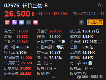 轩竹生物上市首日涨超128%。公开发售阶段轩竹生物获约4908.33倍超额认购,共接获近37.60万份有效申请。由于认购倍数极高,公开发售股份最终数目为673.35万股,占全球发售股份总数的约10%。申购一手的投资者获配发股份的几率极低,中签率仅为1%。国际配售部分同样获得超额认购,倍数约为10.15倍。