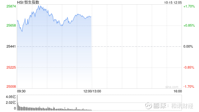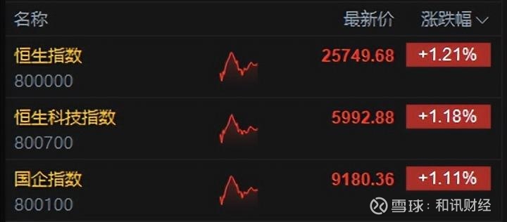 10月15日消息,港股三大指数集体上涨。截至午间收盘,恒生指数涨1.21%,报25749.68点,恒生科技指数涨1.18%,国企指数涨1.11%。盘面上,科网股普涨,哔哩哔哩涨超3%,阿里巴巴、联想涨超2%,小米、京东涨超1%;建材水泥股涨幅居前,中国建材涨超6%;新消费概念普涨,老铺黄金涨超6%;航空股活跃,东方航空涨超5%;轩竹生物上市首日涨超128%。