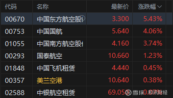 航空股活跃,东方航空涨超5%。国信证券发布研报称,四季度进入出行淡季,去年同期公商务出行需求相对较弱,今年同比或有一定修复。未来运力供给增速放缓确定性增强,若出行需求能保持稳增,带动航司座收持续修复,有望带来航司业绩高弹性;叠加油价中枢下行、汇率稳定等,航司利润向上空间可期。