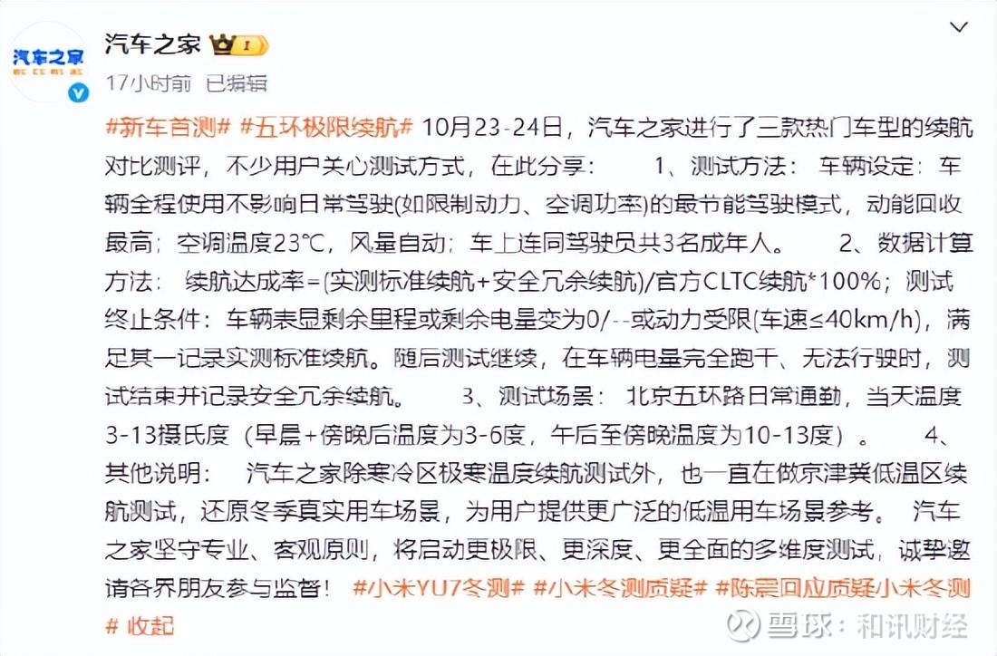10月29日晚,汽车之家发文回应公众对小米YU7等车型冬测质疑,从测试方法、数据计算方法、测试场景以及其他因素4个维度说明测试情况: