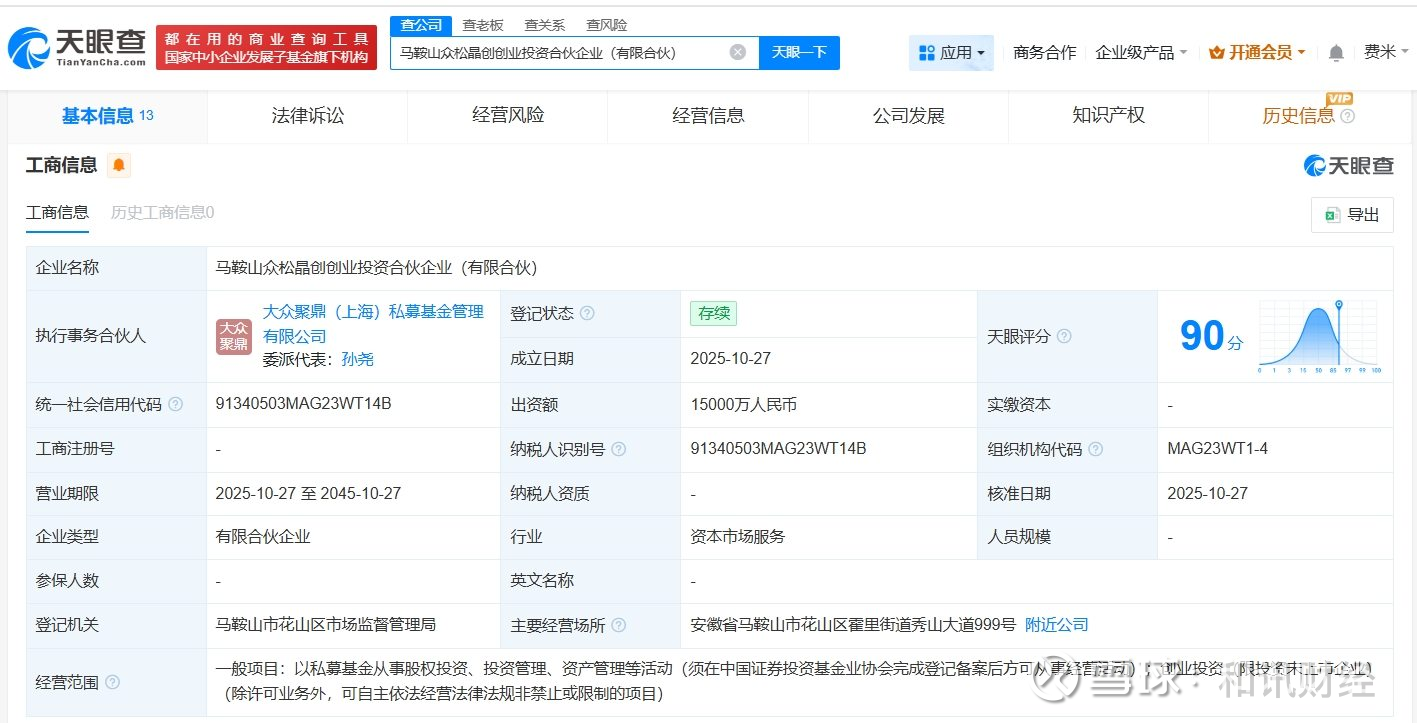 天眼查App显示,近日,马鞍山众松晶创创业投资合伙企业(有限合伙)成立,执行事务合伙人为大众聚鼎(上海)私募基金管理有限公司,出资额1.5亿人民币,经营范围为以私募基金从事股权投资、投资管理、资产管理等活动,创业投资,由大众交通(600611)、大众聚鼎(上海)私募基金管理有限公司、晶科电子股份(02551.HK) 等共同出资。