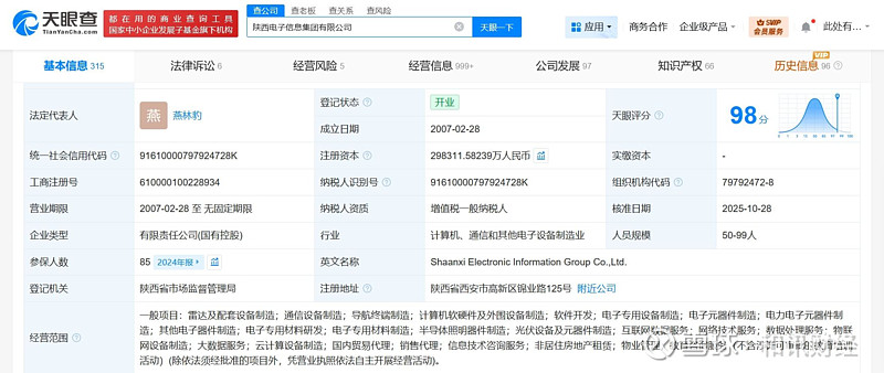天眼查App显示,近日,陕西电子信息集团有限公司发生工商变更,注册资本由约24.8亿人民币增至约29.8亿人民币,增幅约20%,同时,多位主要人员均发生变更。