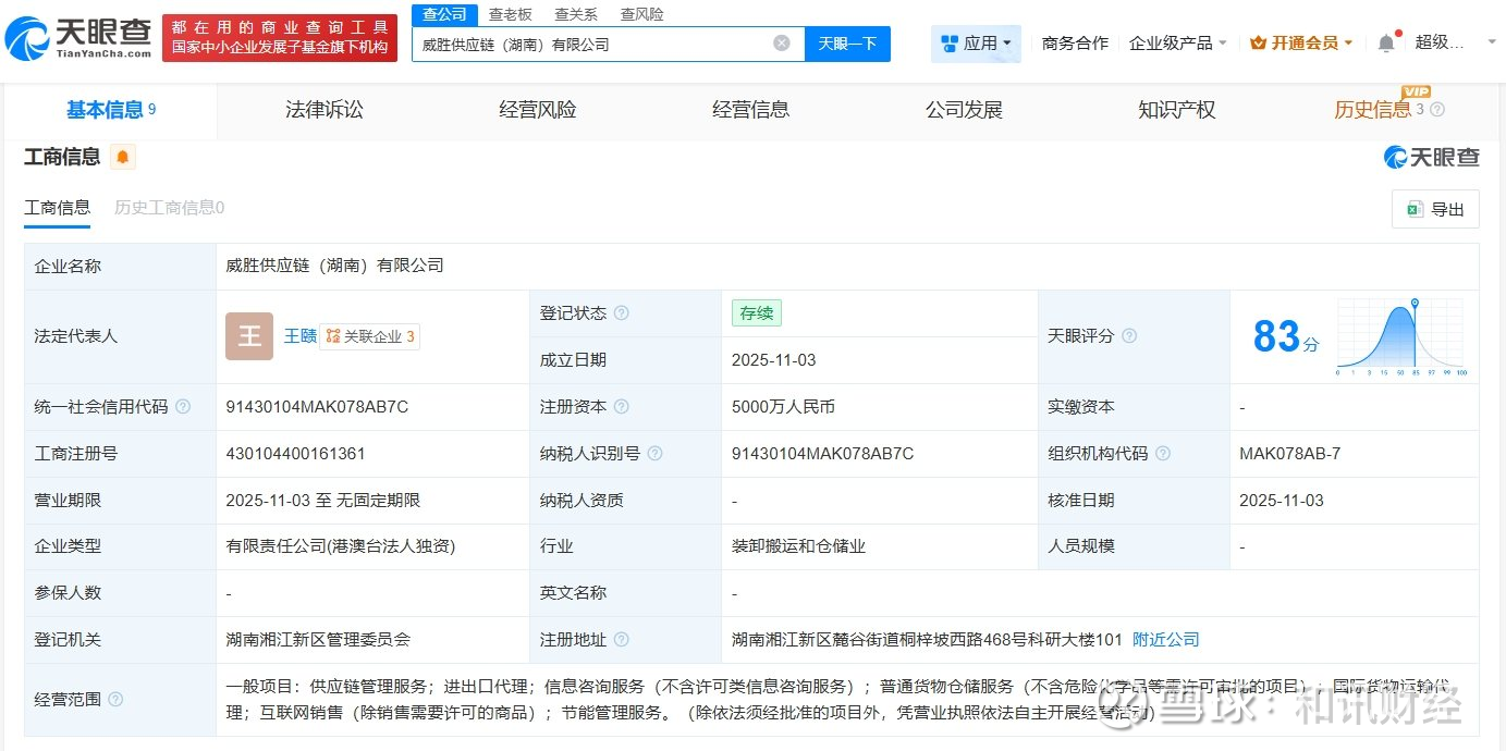 天眼查App显示,近日,威胜供应链(湖南)有限公司成立,法定代表人为王赜,注册资本5000万人民币,经营范围包括供应链管理服务、进出口代理、信息咨询服务、普通货物仓储服务等。股东信息显示,该公司由威佳创建有限公司全资持股。对外投资信息显示,威佳创建有限公司持股威胜集团有限公司、威胜信息技术股份有限公司等公司。