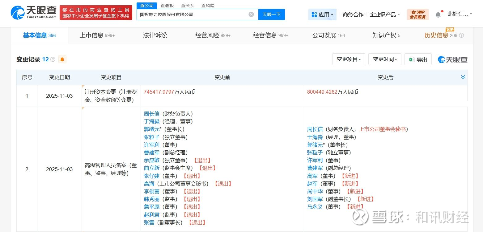 天眼查工商信息显示,近日,国投电力(600886)发生工商变更,注册资本由约74.54亿人民币增至约80.04亿人民币,增幅约7%,同时,多位高管发生变更。