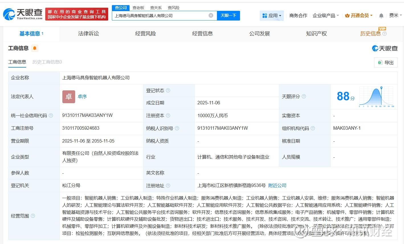 天眼查工商信息显示,11月6日,上海德马具身智能机器人有限公司成立,法定代表人为卓序,注册资本1亿人民币,经营范围包括智能机器人销售、工业机器人制造、特殊作业机器人制造等。股东信息显示,该公司由德马科技(688360)全资持股。