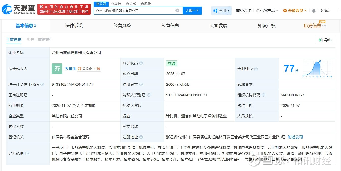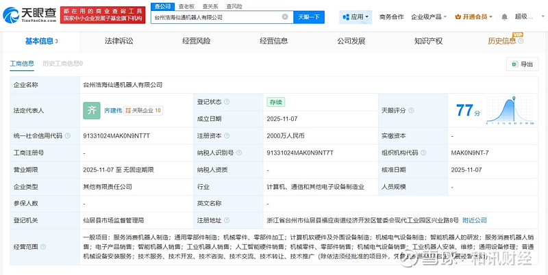 天眼查工商信息显示,近日,台州浩海仙通机器人有限公司成立,法定代表人为齐建伟,注册资本2000万人民币,经营范围包括服务消费机器人制造、通用零部件制造、智能机器人销售等。股东信息显示,该公司由浙江仙通(603239)、上海浩海星空机器人有限公司共同持股。