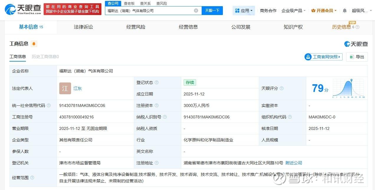 天眼查App显示,近日,福斯达(湖南)气体有限公司成立,法定代表人为江东,注册资本3000万人民币,经营范围包括气体、液体分离及纯净设备制造,机械设备租赁,节能管理服务等。股权全景穿透图显示,该公司由福斯达(603173)旗下杭州福斯达气体能源有限公司以及常德天盛电化有限公司共同持股。