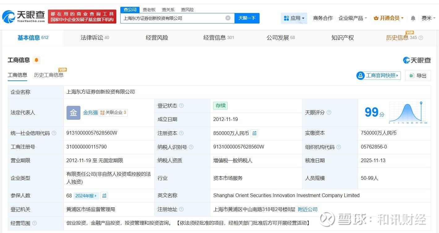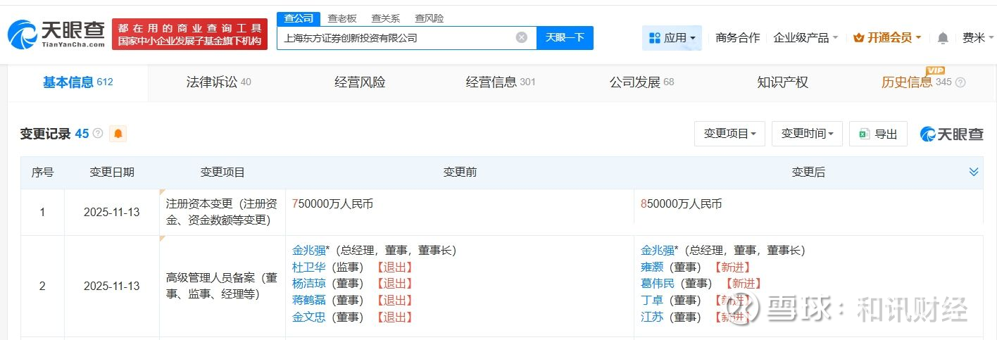 天眼查工商信息显示,近日,上海东方证券创新投资有限公司发生工商变更,注册资本由75亿人民币增至85亿人民币,增幅约13%,同时,多位主要人员发生变更。