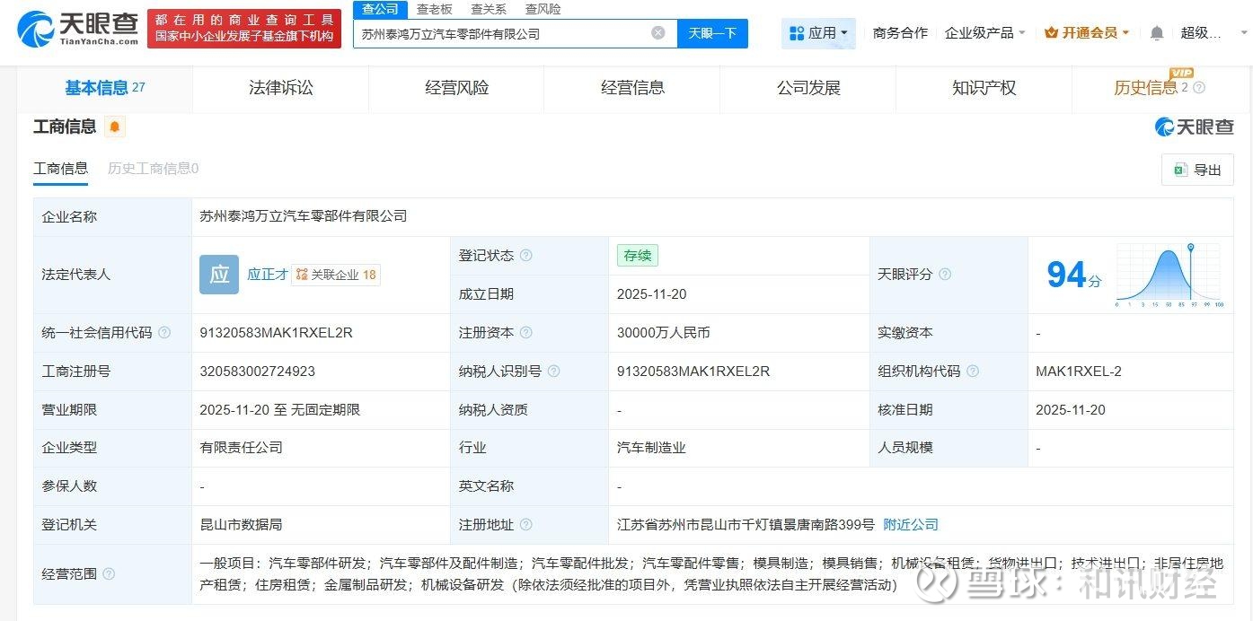 天眼查App显示,近日,苏州泰鸿万立汽车零部件有限公司成立,法定代表人为应正才,注册资本3亿人民币,经营范围包括汽车零部件研发、汽车零部件及配件制造、汽车零配件批发、模具制造等。股东信息显示,该公司由浙江泰鸿万立科技股份有限公司全资持股。