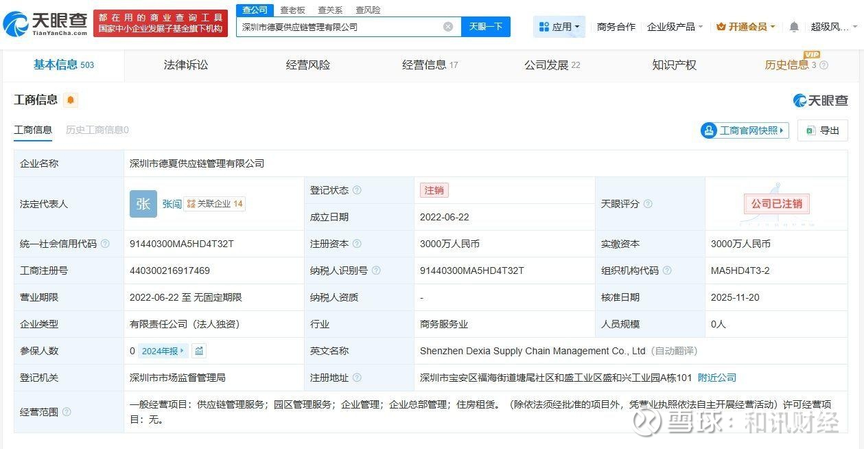 天眼查App显示,近日,深圳市德夏供应链管理有限公司登记状态由存续变更为注销。