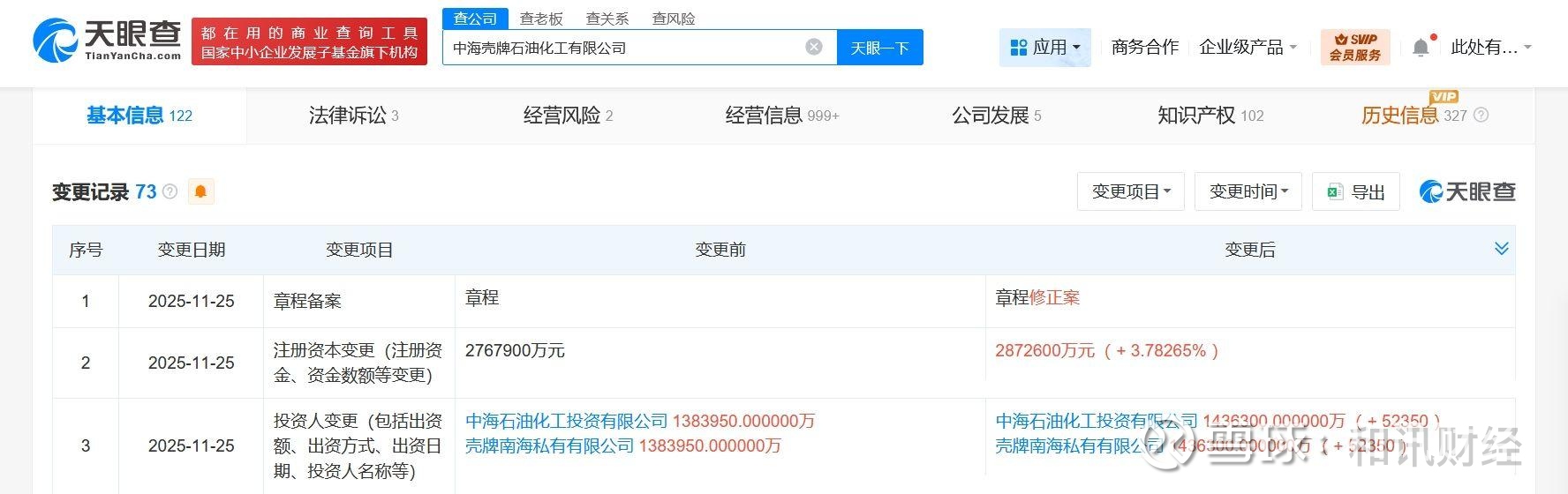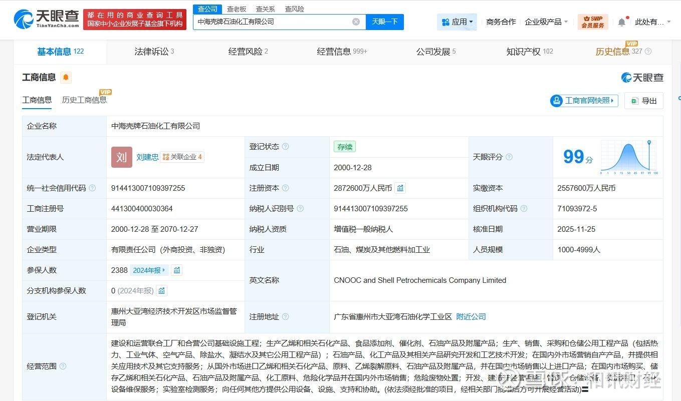 天眼查工商信息显示,近日,中海壳牌石油化工有限公司发生工商变更,注册资本由约276.8亿人民币增至约287.3亿人民币,增幅约4%。